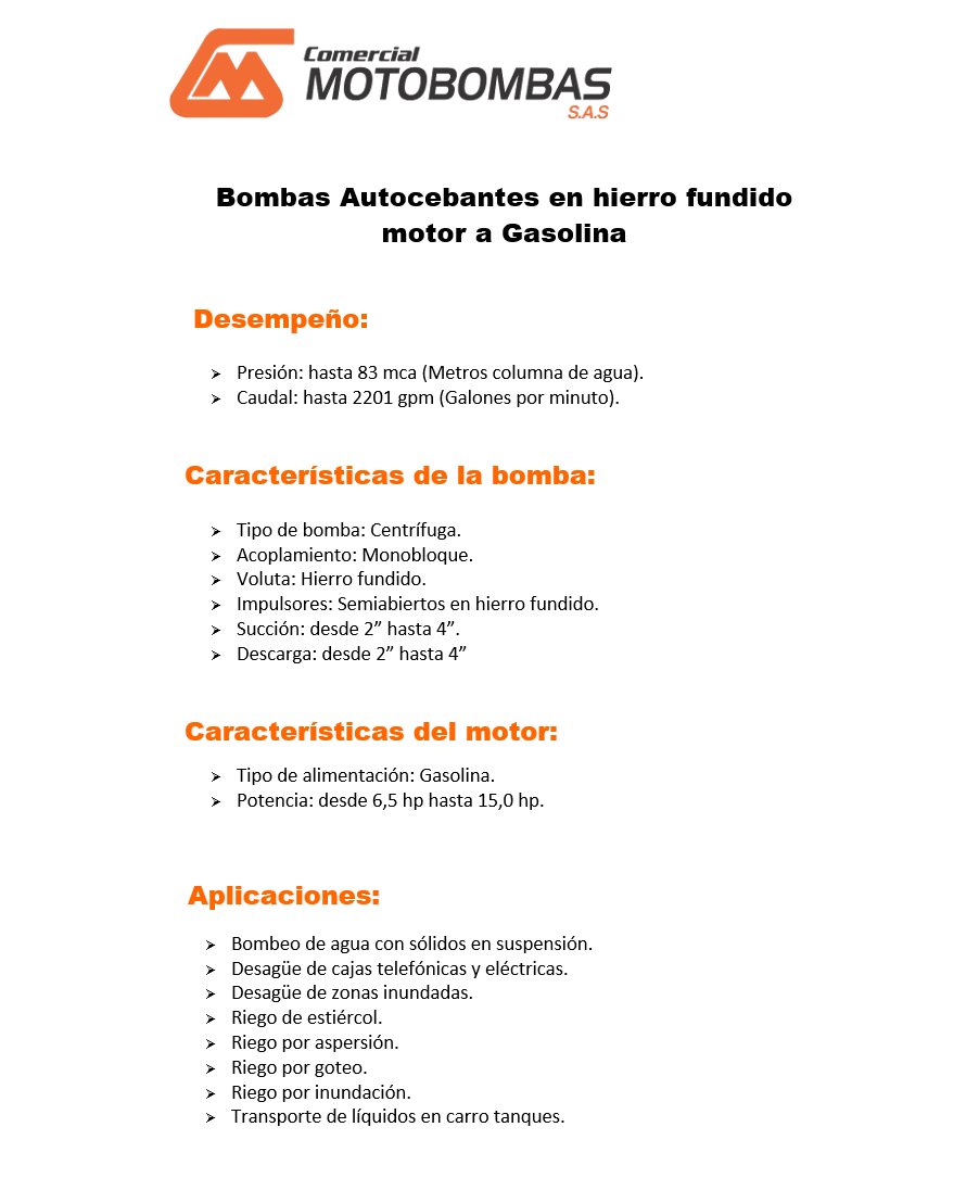 Bombas Autocebantes material en hierro con motor KOHLER a gasolina