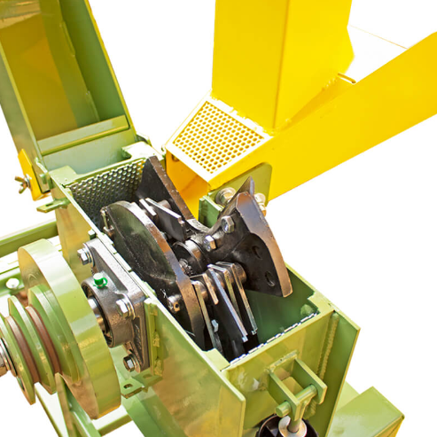 Este triturador se utiliza con motor a gasolina o diésel, incluyendo un embrague mecánico que actúa por deslizamiento de las bandas, facilitando el arranque y desconexión del mismo. También se puede utilizar con motores eléctricos usando un arrancador estrella–triángulo.